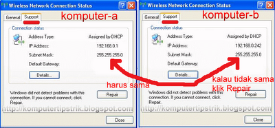 Masing - masing komputer harus mendapat nilai subnet mask yang sama : misal disini subnet masknya didapat 255.255.255.0 (kelas C), komputer-a dan komputer-b harus sama yaitu 255.255.255.0