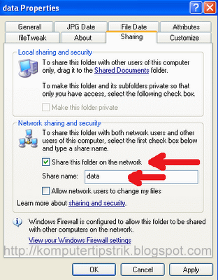 --> Contreng pada Share this folder on network, isi Share name.--> klik OK