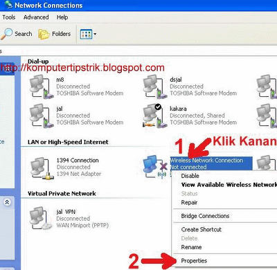 -masuk ke network Connections-->klik kanan pada wireless network --> klik properties.